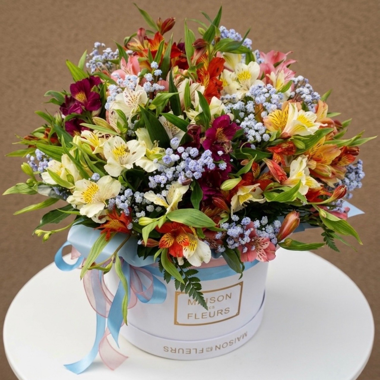Композиция на фото: 19 альстромерий, гипсофила, коробка фирменная