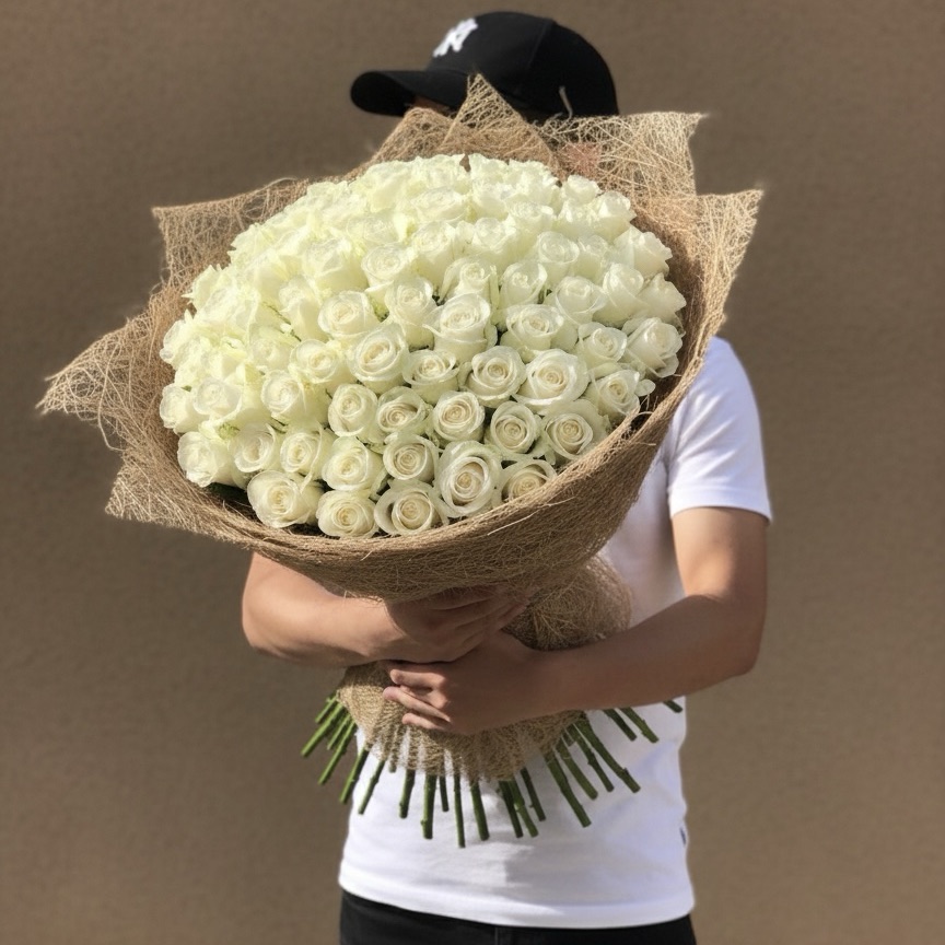 Огромный, высокий букет из 51 метровой белой розы, стильно упакованный...