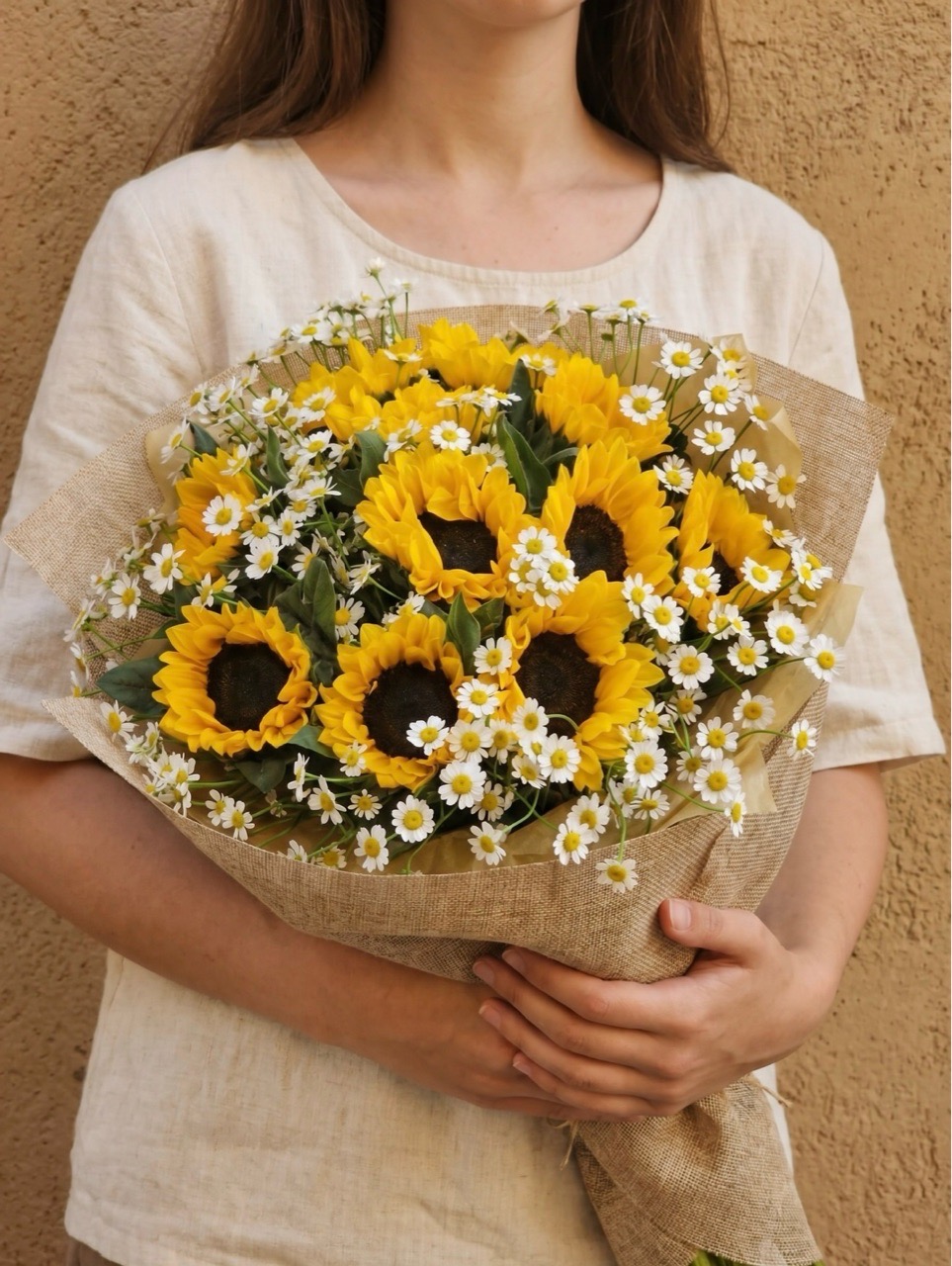Этот букет настоящее воплощение солнца в цветах. Крупные подсолнухи символизируют радость, энергию и искренние эмоции, а изящная ромашка добавляет композиции легкости, нежности и природной гармонии.