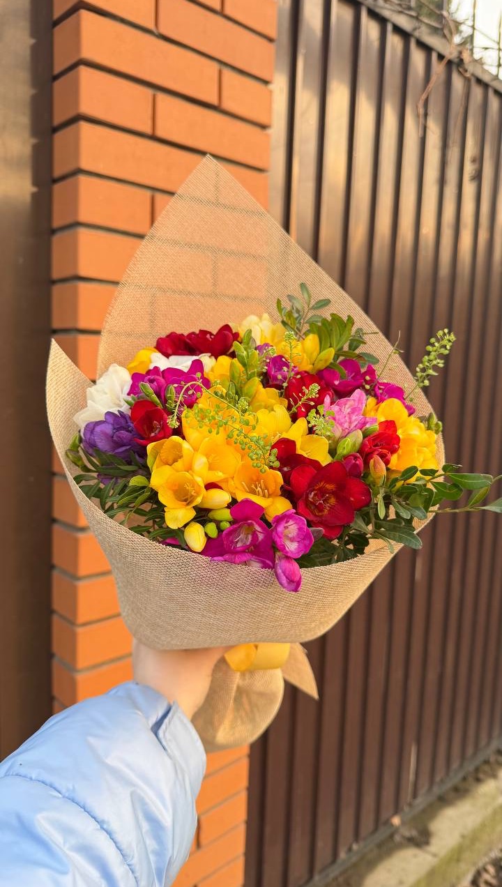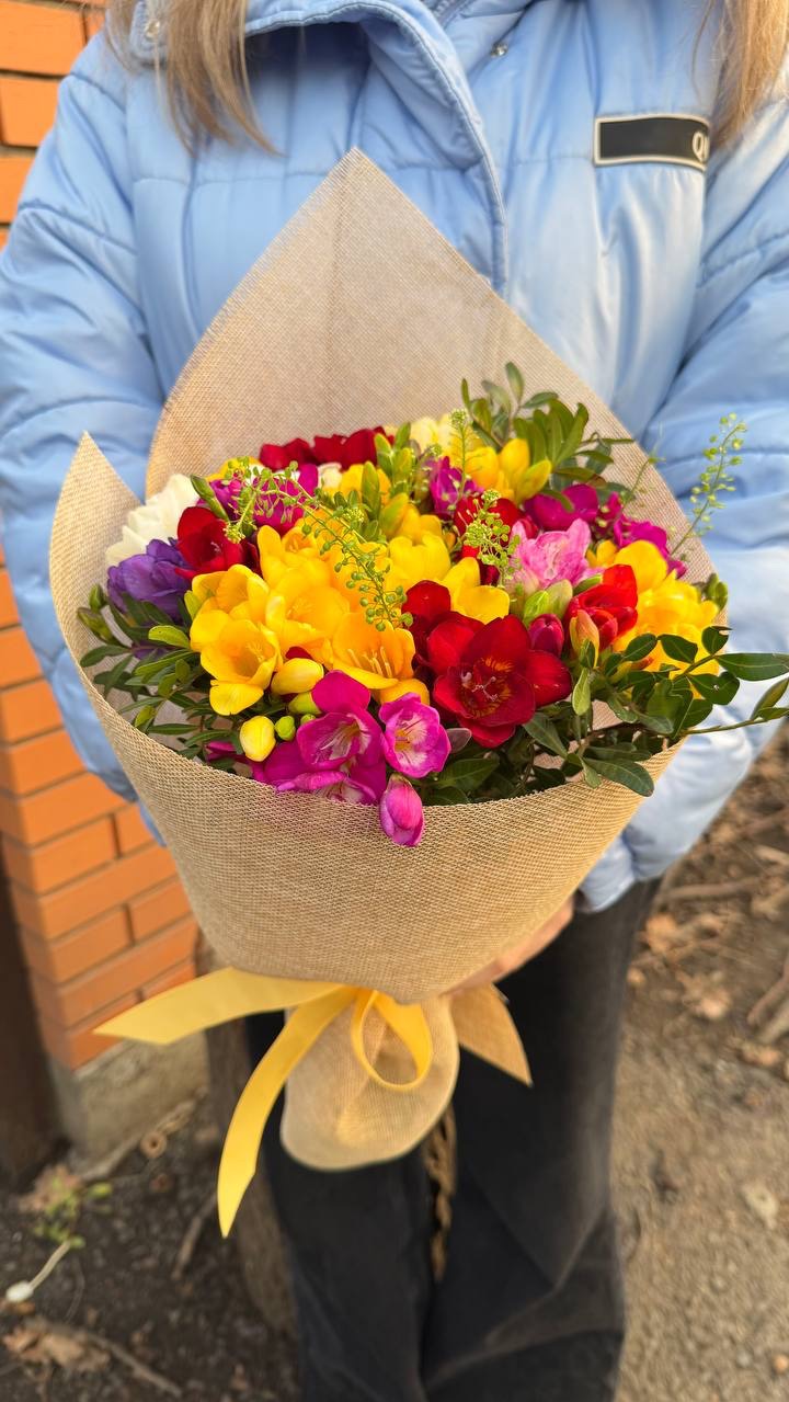 Яркий букет из 19 фрезий. Лёгкий, свежий и очень ароматный.