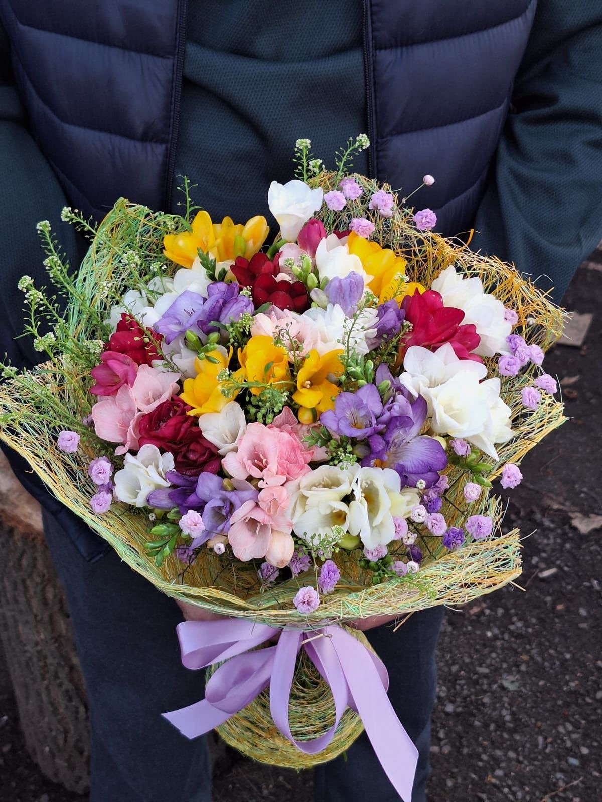 Ароматный букет из фрезий разных расцветок, украшенный зеленью и упакованный в бумагу крафт.