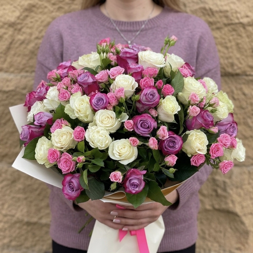 Объёмный букет из 51 розы белых и сиреневых, 20 розовых кустовых роз с добавлением голландской зелени, в стильном оформлении.