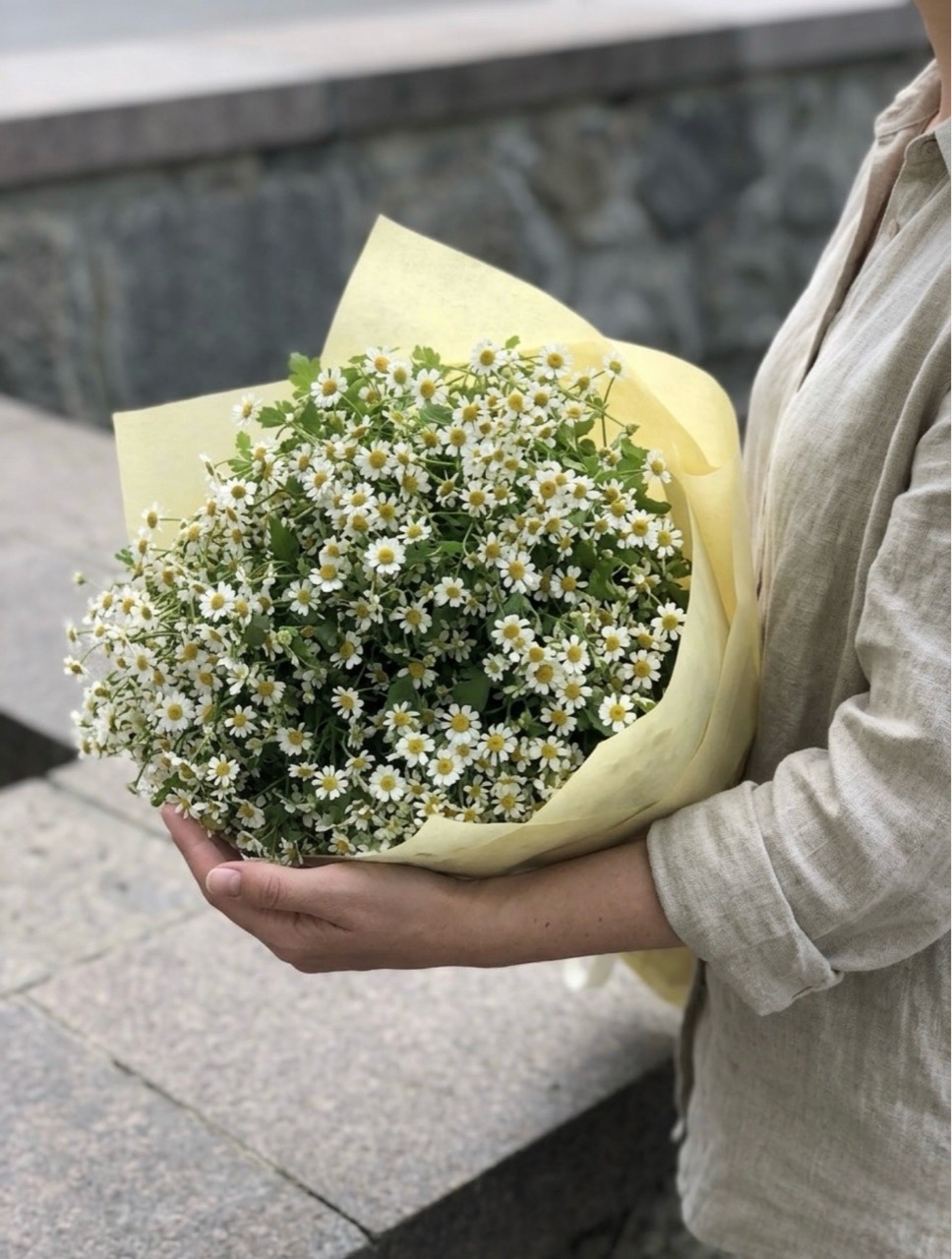 Букет на фото: ромашки мелкоцветные, упаковка