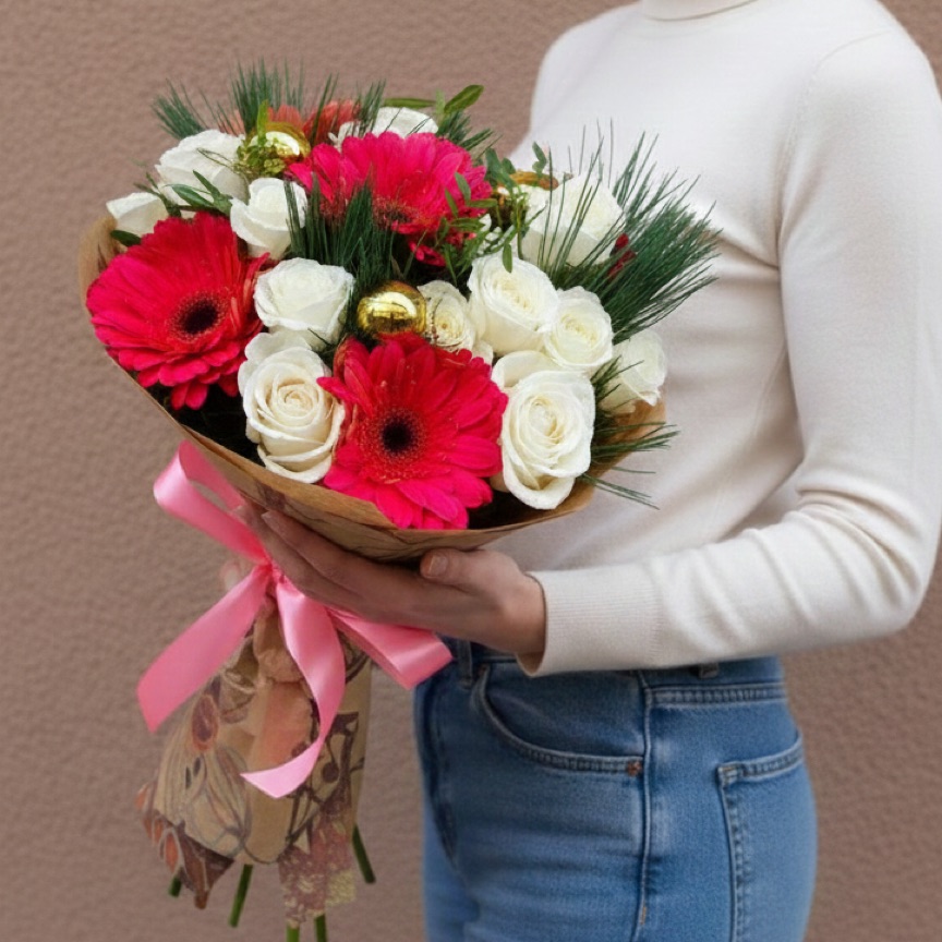 Букет на фото: гербера розовая 5, роза белая 5, роза кустовая белая 3, еловые ветки, новогодний декор , упаковка бумага крафт