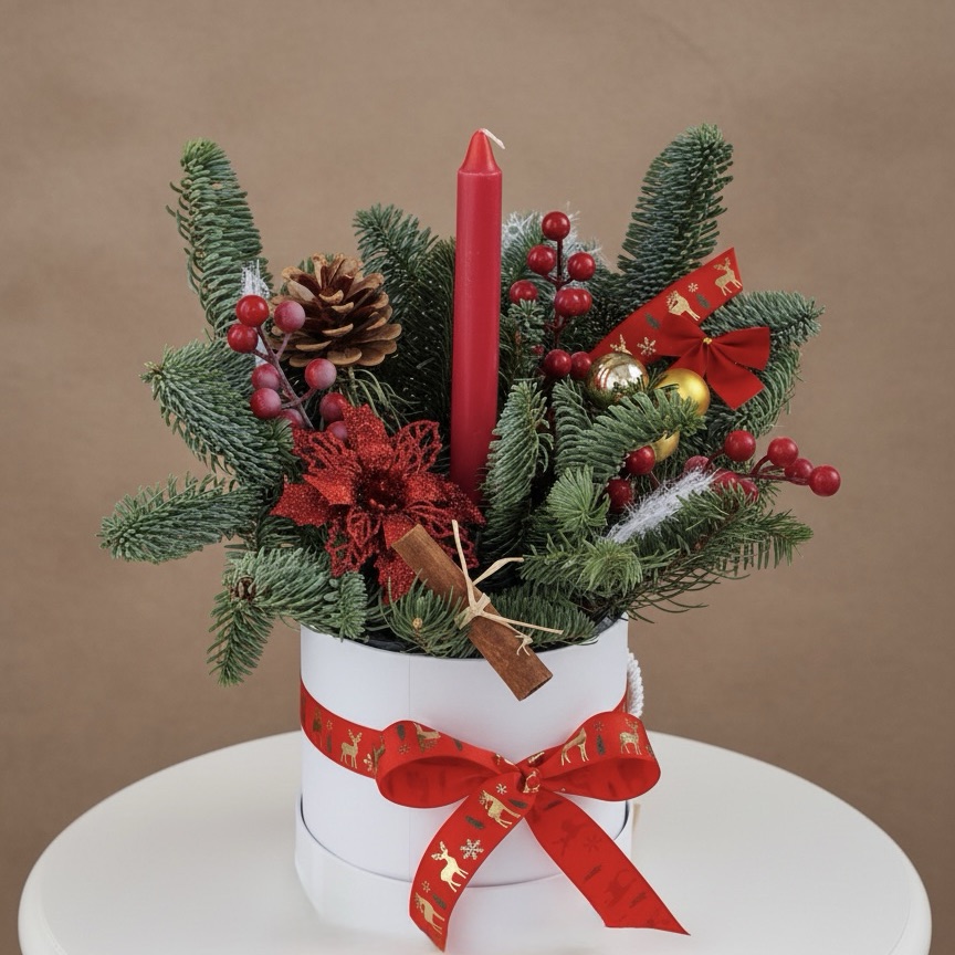 Композиция «Новогодняя сказка» собрана из свежих еловых ветвей с добавлением декоративных ягод, шишек, новогодних украшений и красной свечи. Оформление в белой коробке с праздничной лентой делает композицию универсальной для любого интерьера. Прекрасный вариант подарка на Новый год и Рождество, сдержанный, уютный и стильный.