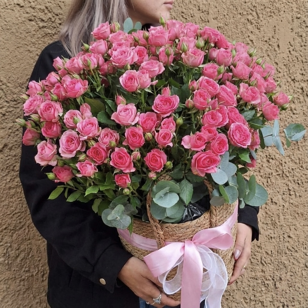 Элегантная композиция в стильном кашпо — идеальный выбор для создания уютной и праздничной атмосферы. Основу составляют нежные розовые кустовые розы, которые гармонично сочетаются с веточками эвкалипта.