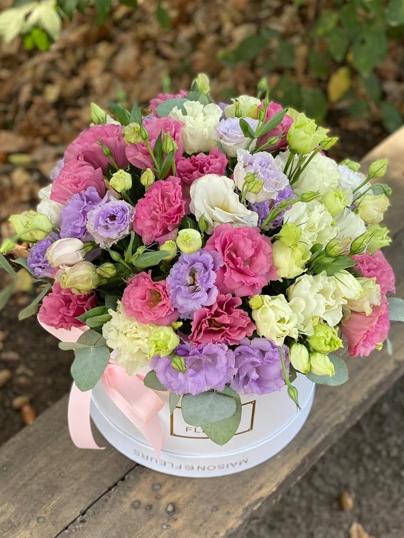 Композиция в стильной коробке из эустом (лизиантусов) нежных оттенков.
