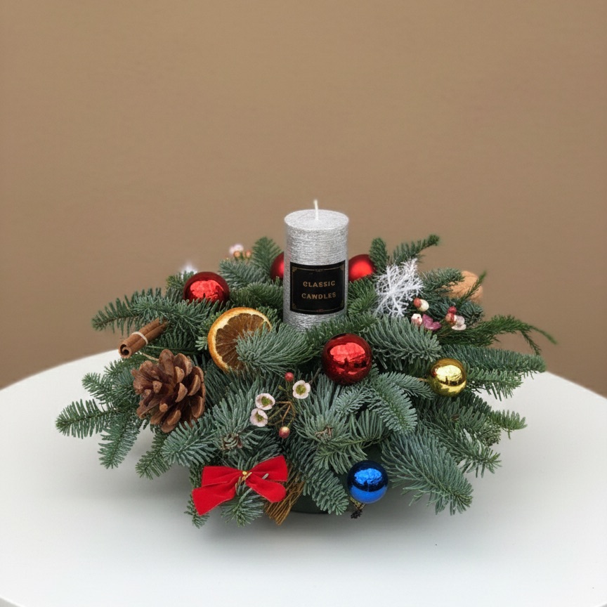 Элегантная настольная новогодняя композиция, созданная для уютной и тёплой атмосферы праздника. В основе свежая натуральная хвоя, украшенная декоративной свечой, шишками, корицей, сушёным апельсином и новогодними шарами в красно-золотых акцентах. Мягкие оттенки хвои гармонично сочетаются с праздничным декором, создавая ощущение уюта и зимнего волшебства.